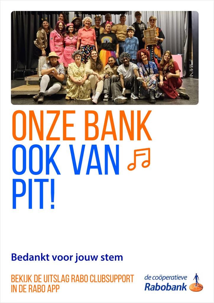 Vanaf 1 september t/m 23 september kun je op ons stemmen bij de Rabo Clubsupport actie. Steun onze Musicalvereniging PIT!, zodat we mooie musicals kunnen blijven spelen! Via 'Lees meer' kunt u uw stem gemakkelijk uitbrengen. Namens alle Pitters super bedankt voor uw stem.